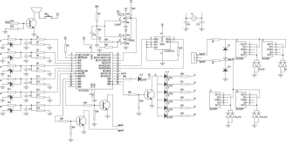 此外,考虑到不同车辆和路况所需制动力不一致,设计中编了8套不同的制动力参数,由于PIC16C63A的程序存储器是4K×14的,因此外扩了Atmel公司的1K的E2PROM AT24C01A用于存放这些参数。通信接口电路用三极管增强驱动能力,同时提高传输距离以及抗干扰性。