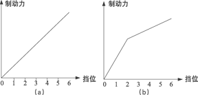系统通过拨动编程开关来调用存放在E2PROM中的各种制动力参数,以适应不同车辆和路况需求。编程开关共有8个,6、7、8用于设置各个档位制动力的大小,6、7、8分别为ON/ON/ON时,制动力为100%;ON/ON/OFF:95%;ON/OFF/ON:90%;ON/OFF/OFF:85%;OFF/ON/ON;:80%;OFF/ON/OFF:75%;OFF/OFF/ON:70%;OFF/OFF/OFF:65%;编程开关5用于设置各个挡位之间制动力的变化情况,为ON时,各个挡位制动力均匀增加,为OFF时,1、2挡增加的快,3、4、5、6挡增加的慢,如图3所示。编程开关4用于设置控制器的软特性,为ON时,控制器的制动力逐渐增加,六挡时的延迟时间约为0.4s,为OFF时,控制器取消软特性。开关1、2、3作为保留功能使用。